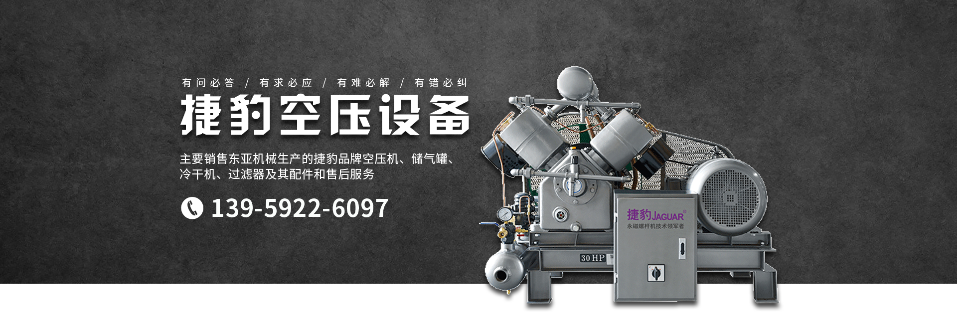 主要銷售東亞機(jī)械生產(chǎn)的捷豹品牌空壓機(jī)、儲(chǔ)氣罐、冷干機(jī)、過(guò)濾器及其配件和售后服務(wù)。